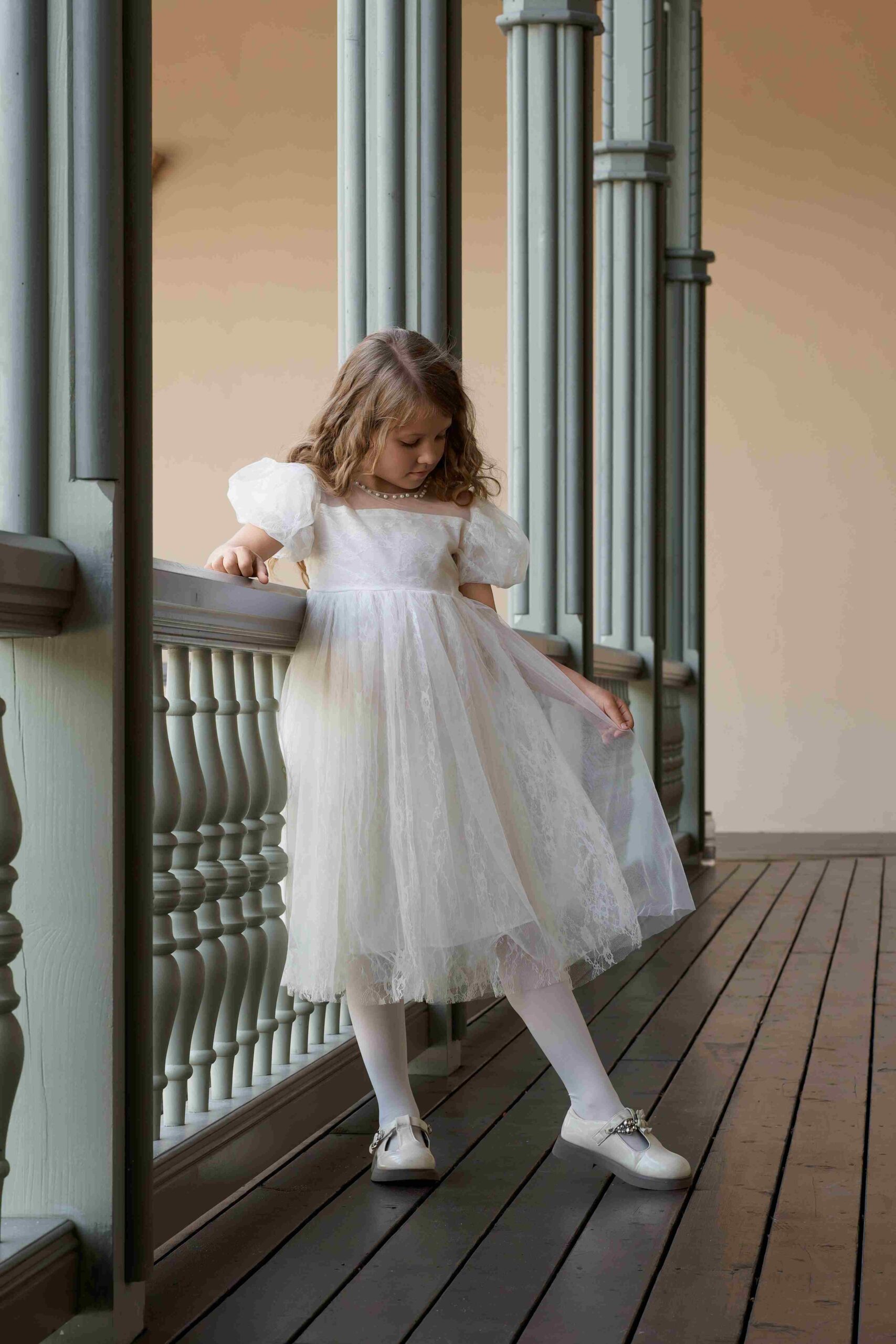 Balta tiulio suknelė mergaitėms (98–128 cm) su nėriniais ir trumpos rankovėmis – elegantiška, šventiška ir patogi mažosioms princesėms.
