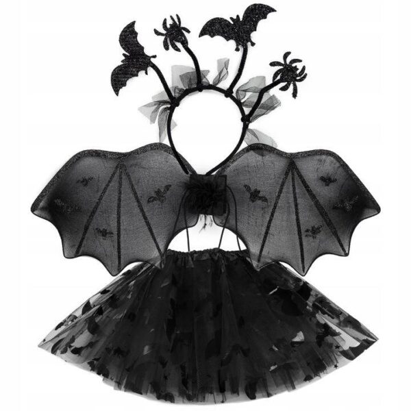 Helovino kostiumai vaikams – Linksmas, žavingas ir nepamirštamas! Šis šikšnosparnio kostiumas mergaitėms taps tikru šventės akcentu! Rinkinį sudaro tiulio sijonas, sparnai ir lankelis – viskas, ko reikia mažajai vampyriukei ar raganai Helovino vakarėlyje, karnavale ar teminėje fotosesijoje. Ryškios detalės prikaustys dėmesį, o patogus kirpimas užtikrins malonų dėvėjimąsi net ilgesnių pramogų metu.