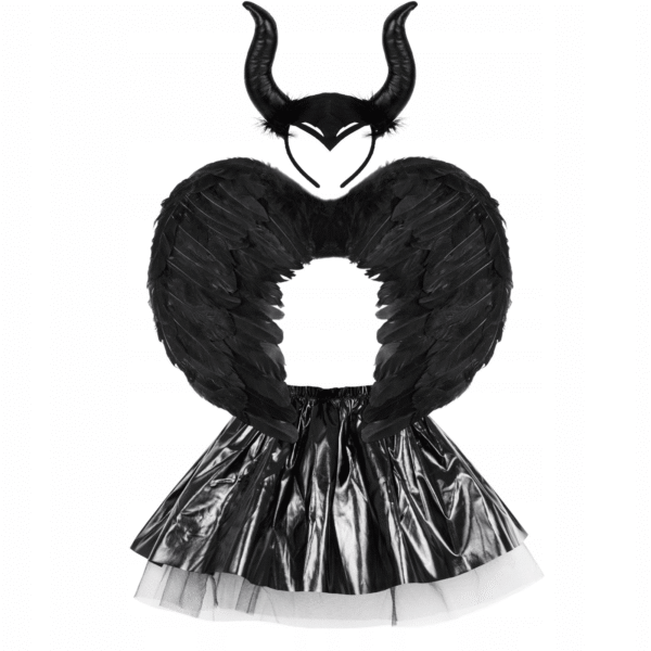 Tamsos raganos Maleficent kostiumas – su sparnais, raguota juosta ir blizgančiu sijonu. Galingas ir įspūdingas įvaizdis Helovinui. 🖤