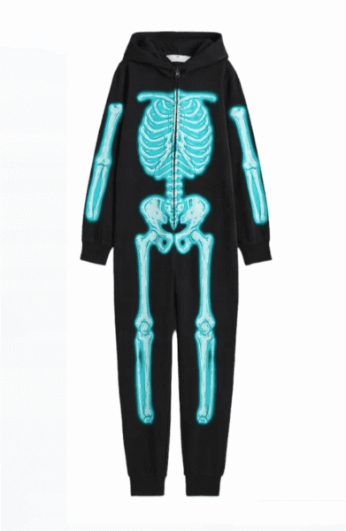 Klasikinis, bet visada madingas Helovino „Skeleton“ kostiumas – su švytinčiais kaulais ir nepriekaištingu H&M patogumu. Puikiai tinka Helovinui, mokyklos vakarėliams ar fotosesijoms!