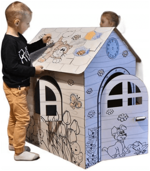 Kartoninis spalvinimo namas, XXL – vaikas gali spalvinti, piešti ir dekoruoti namelį taip, kaip įsivaizduoja savo svajonių namus.
