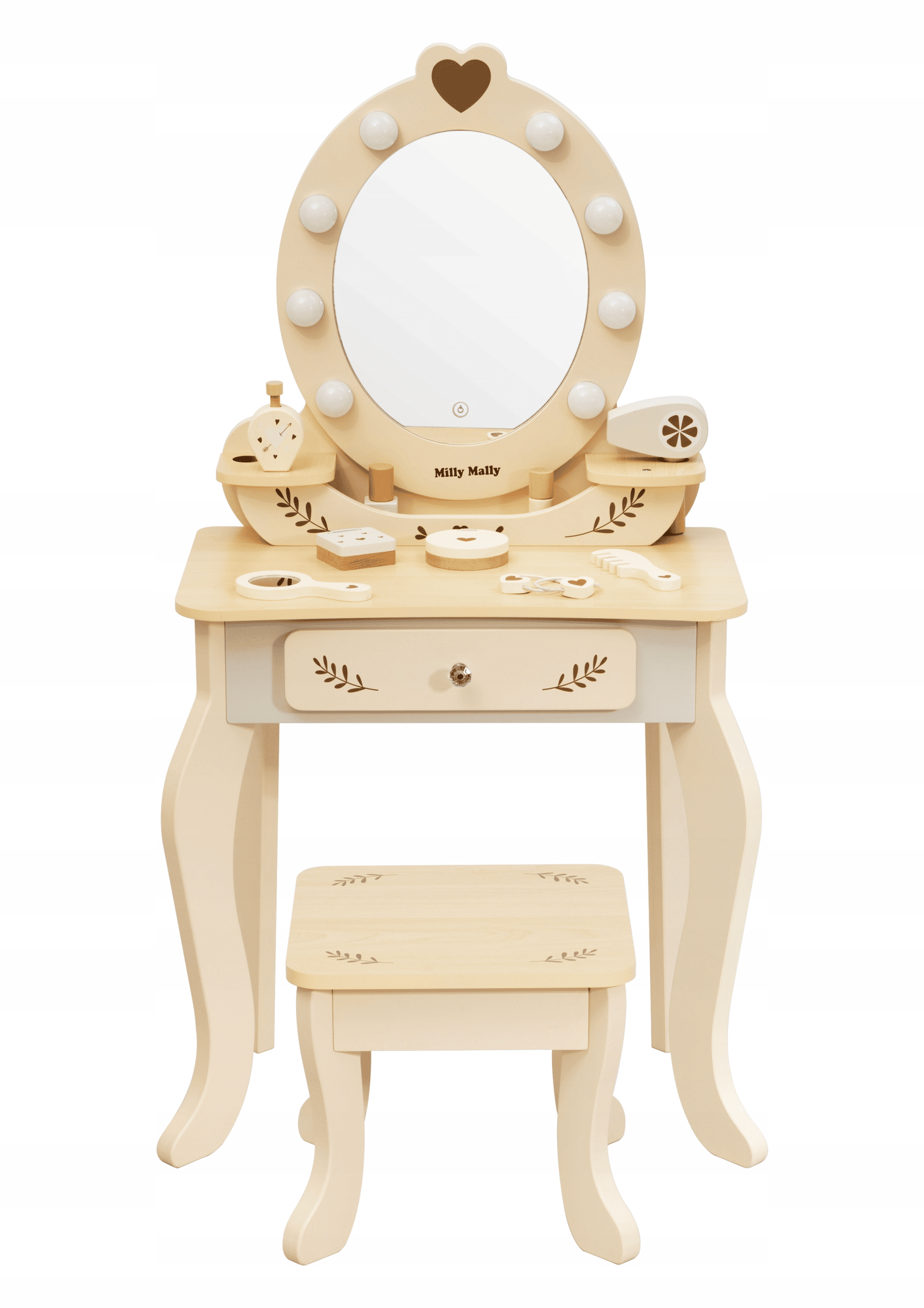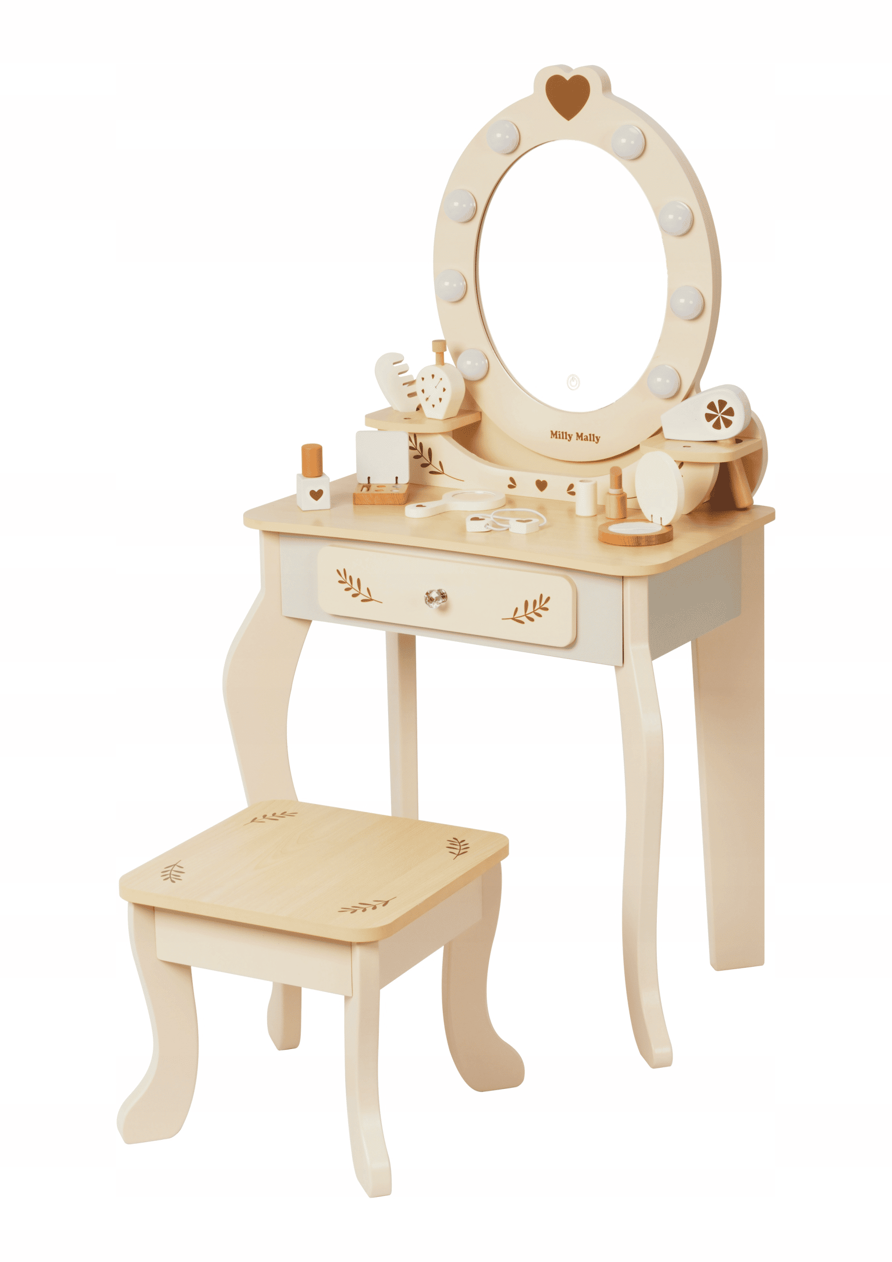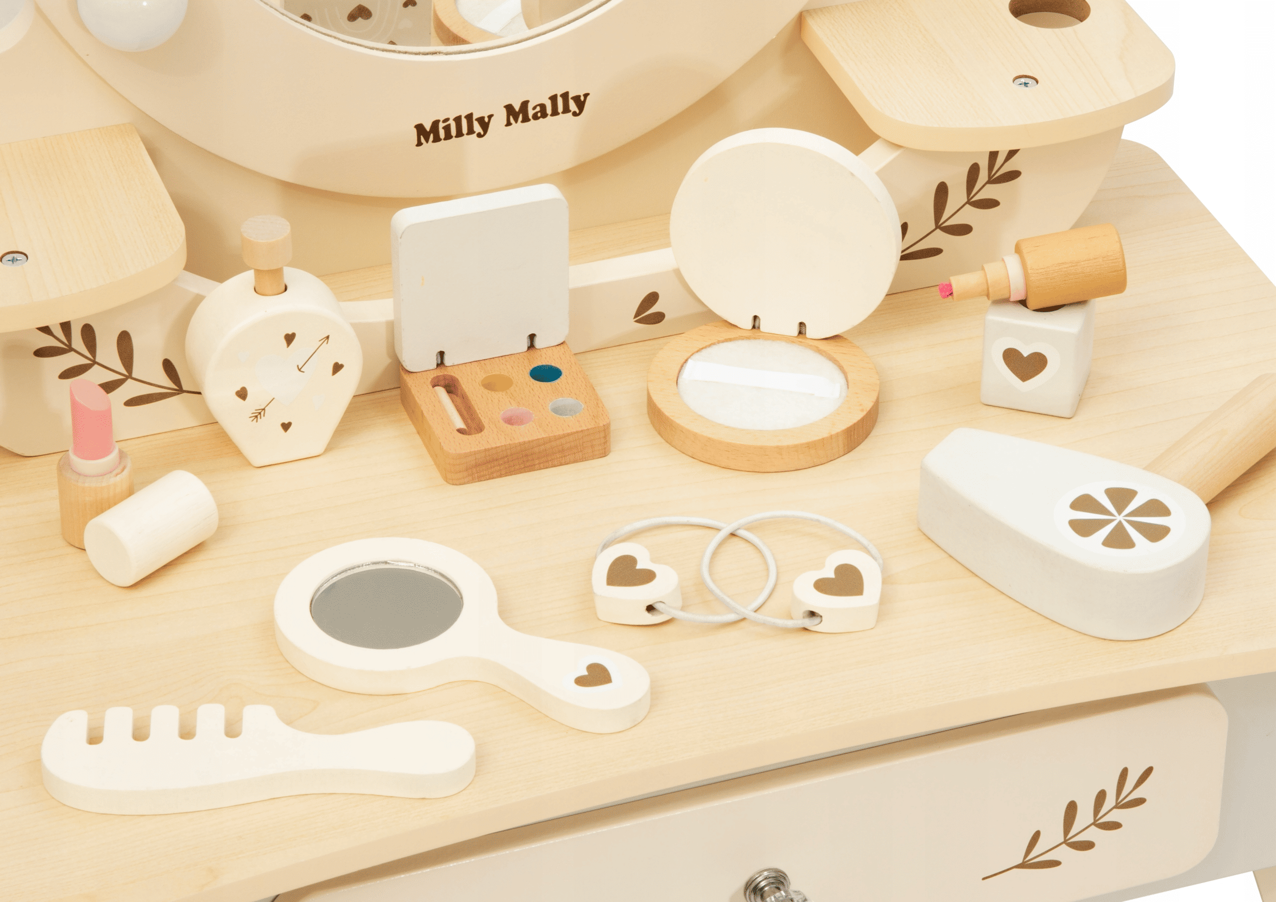 • Mediniai žaidimų aksesuarai: plaukų džiovintuvas, kvepalų buteliukas, nagų lakas, akių šešėlių paletė, šukos, lūpų dažai, kompaktinė pudra, veidrodis, 2 plaukų juostos su mediniu elementu