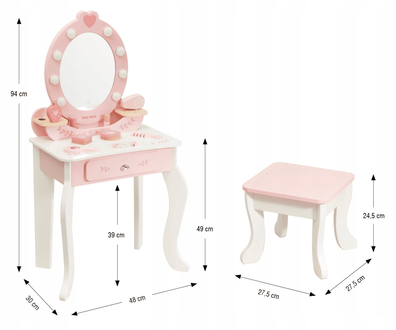 • Matmenys: staliukas 30 x 48 x 94 cm, taburetė 27,5 x 27,5 x 24,5 cm, stalo aukštis 49 cm