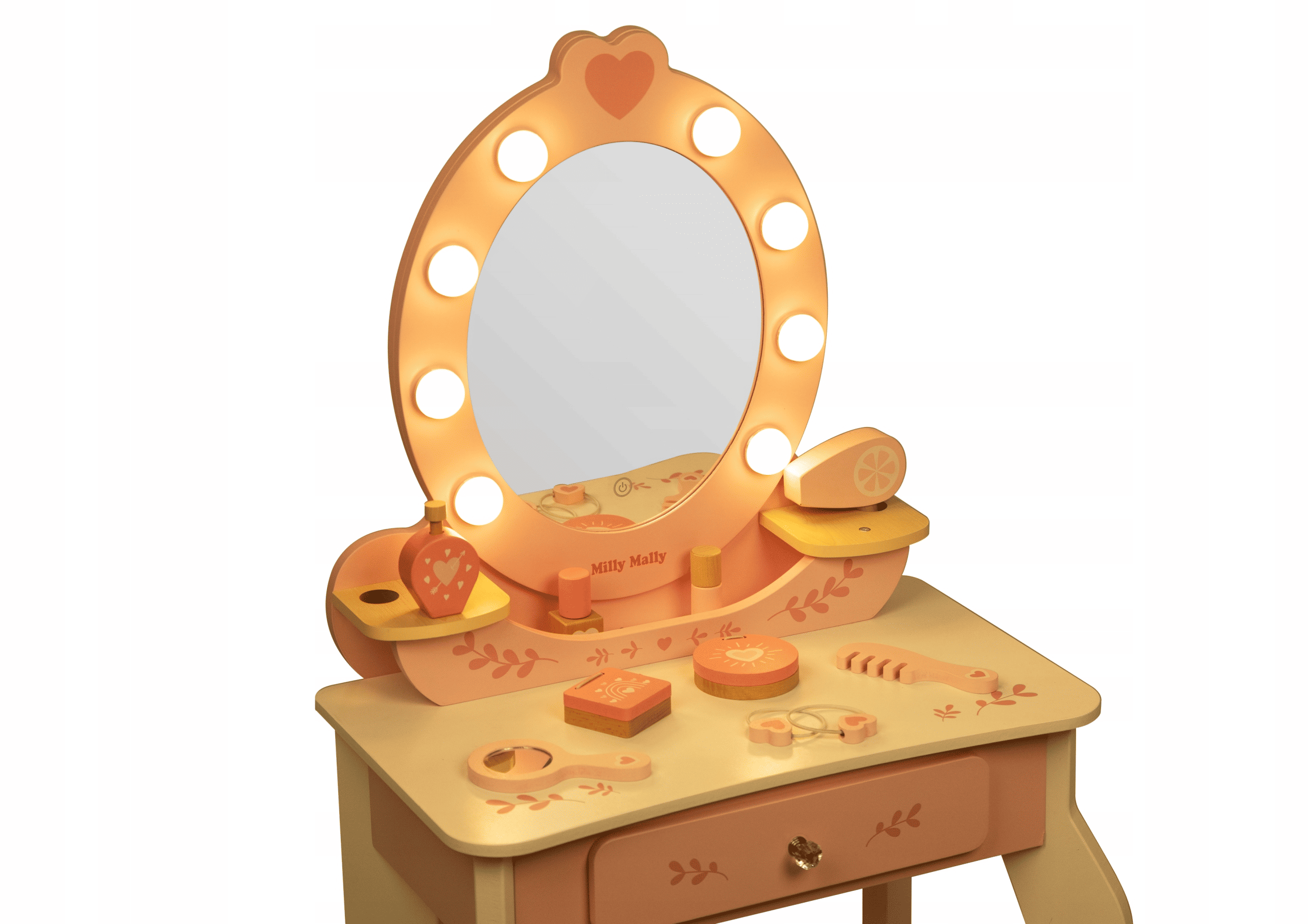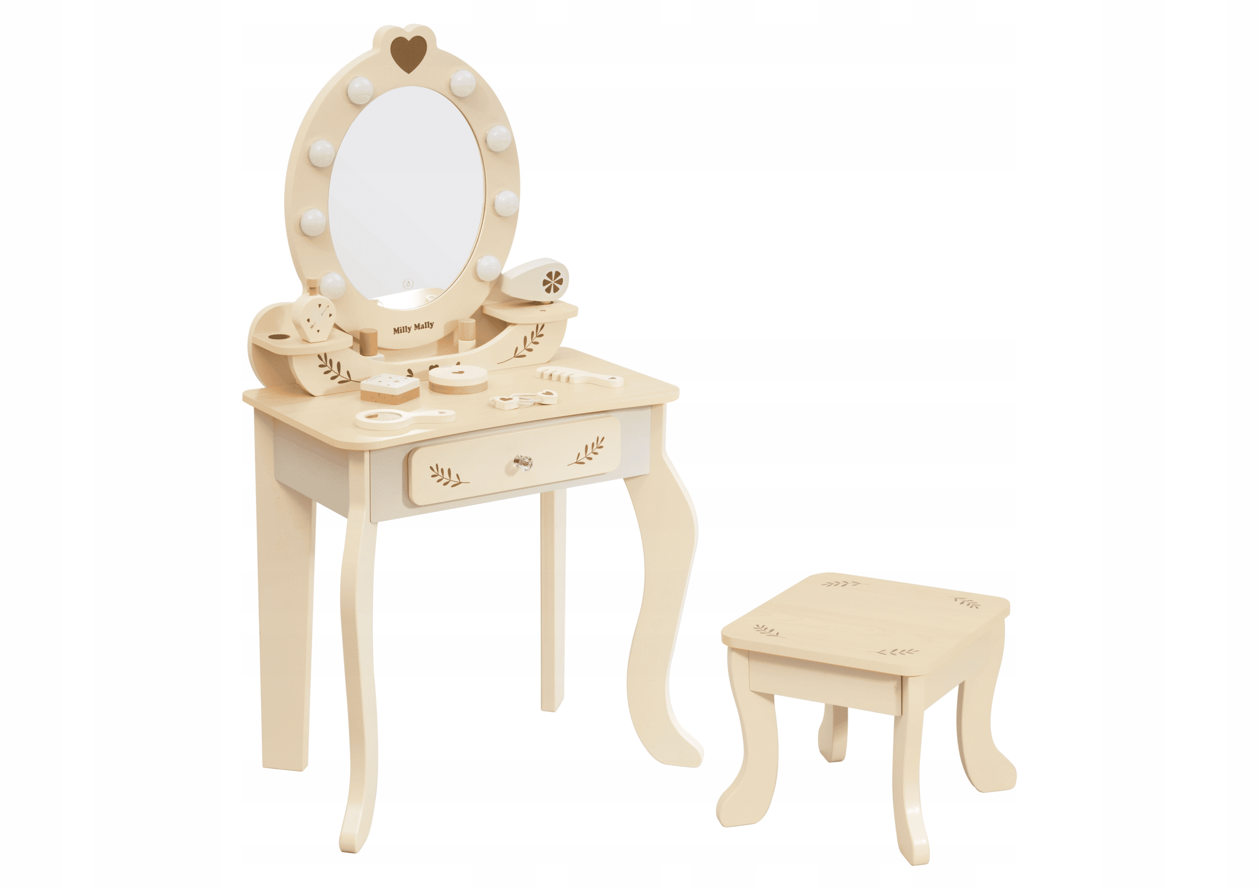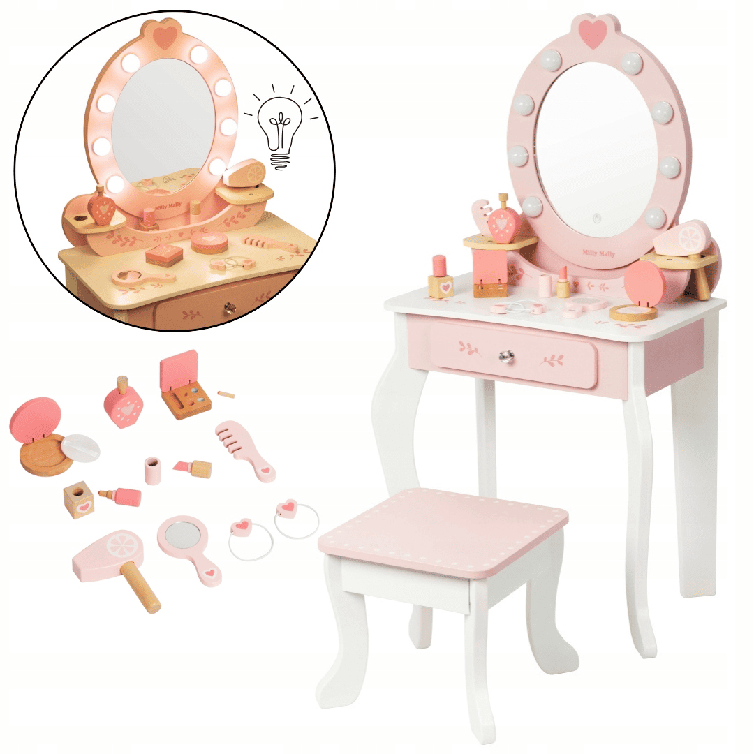 ELLY kosmetinis staliukas su LED veidrodžiu, kėdute ir priedais – stilingas ir edukacinis žaidimas kiekvienai mergaitei nuo 3 metų.