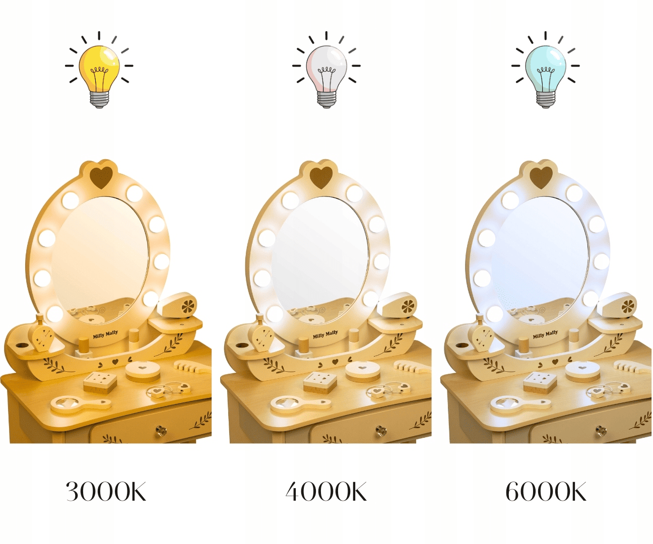 Veidrodyje įmontuotos 8 saugios LED lemputės, kurias galima reguliuoti trimis šviesos režimais: Šilta šviesa (3000 K) – jauki atmosfera. Neutrali šviesa (4000 K) – natūralus dienos efektas. Šalta šviesa (6000 K) – profesionalus grožio studijos švytėjimas