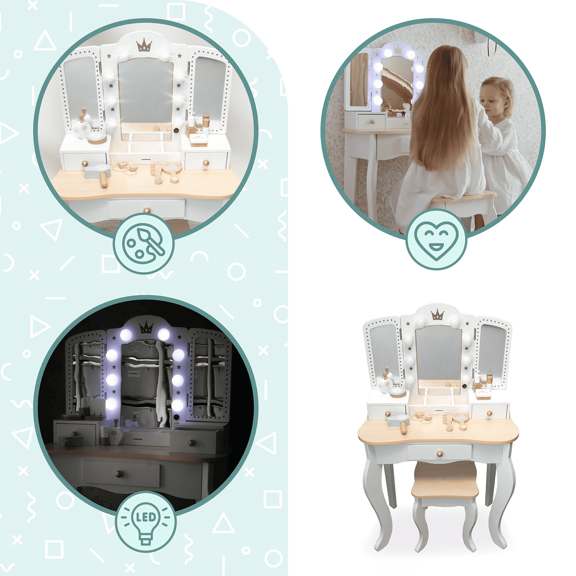 Magiškas kosmetinis staliukas su LED apšviestu veidrodžiu, kėdute ir 10 priedų. Sukurtas mažosioms princesėms, mėgstančioms žaidimus, kūrybą ir saviraišką. Saugi, sertifikuota ir ilgaamžė dovana vaikystės žaidimams.