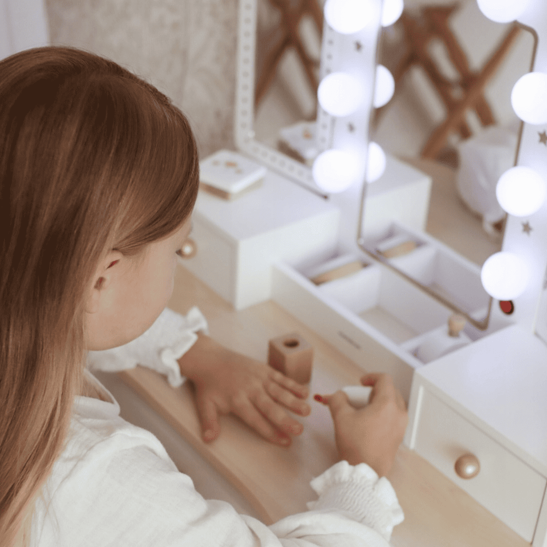 Kosmetinis staliukas mergaitei su priedais – tai vieta, kur žaidimas susitinka su svajonėmis, kur mažos rankytės atranda grožio ritualų magiją, o veidrodžio šviesoje gimsta kūryba ir pasitikėjimas savimi.