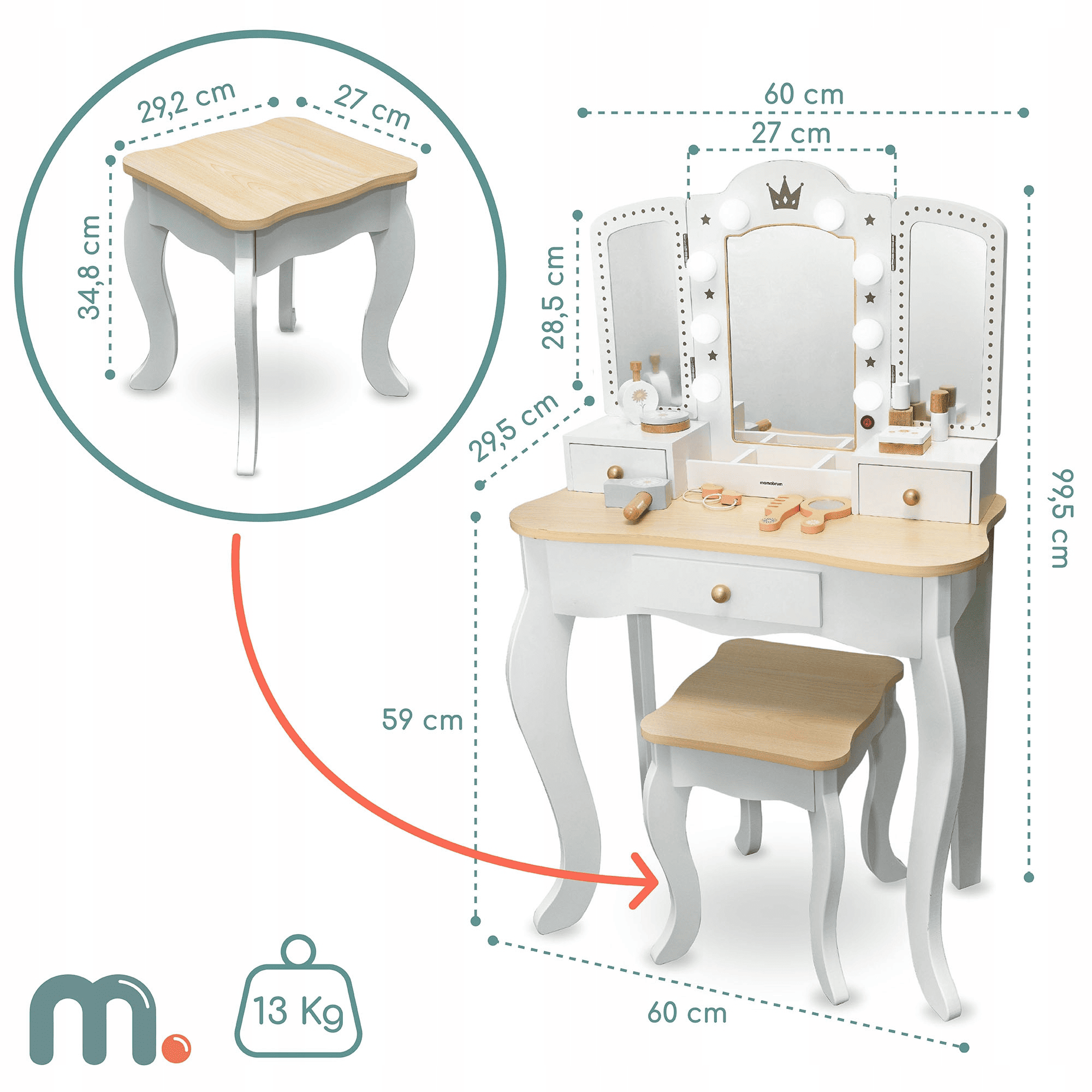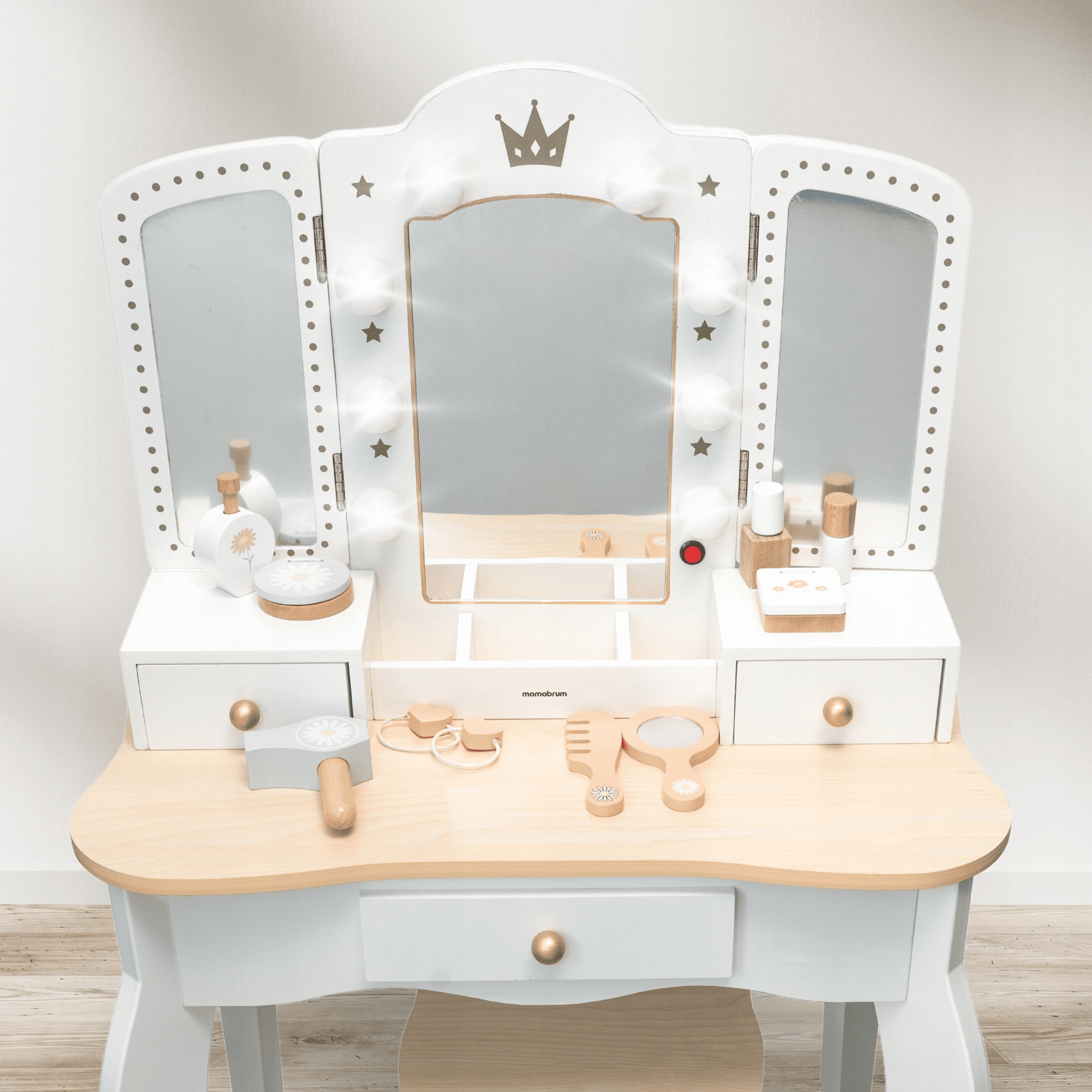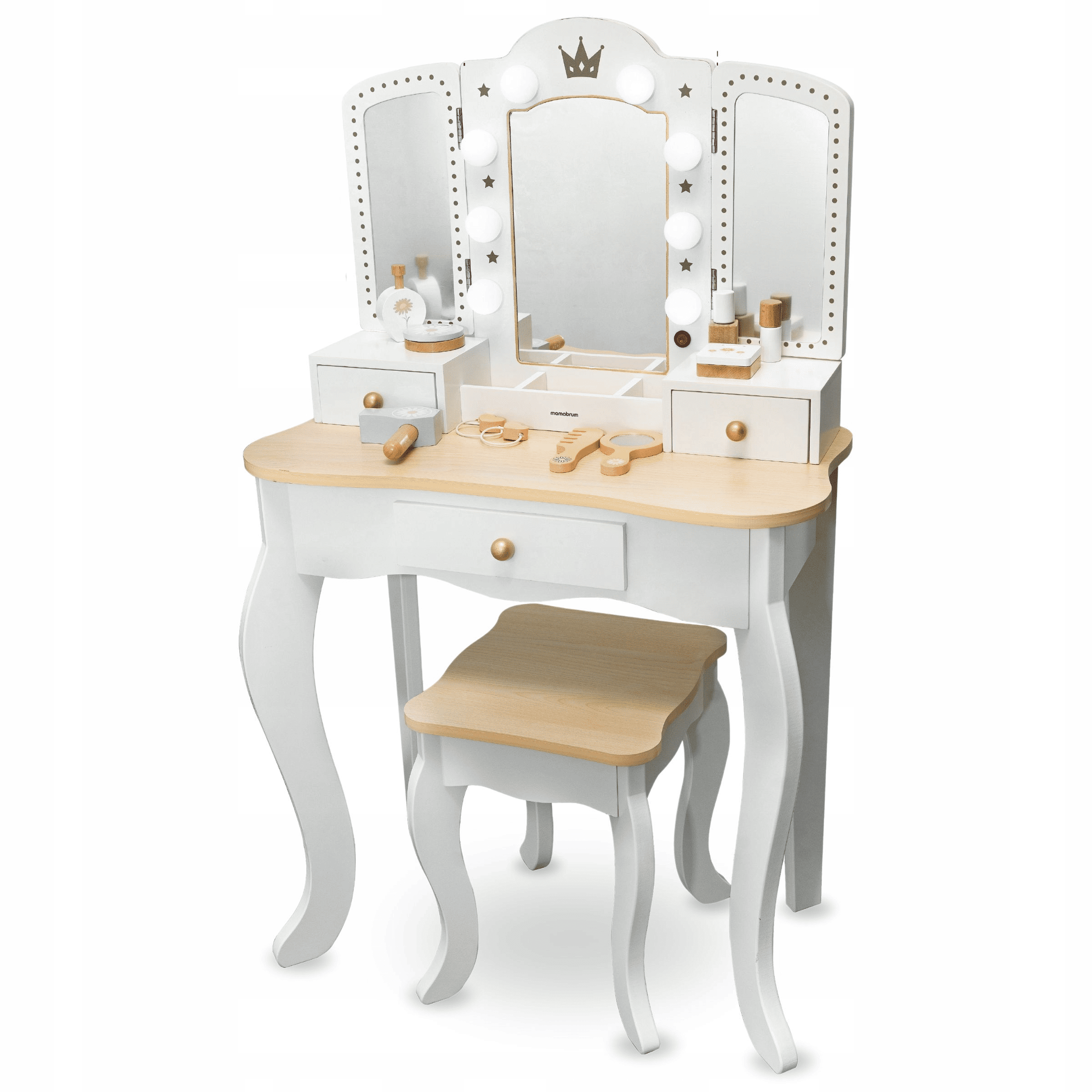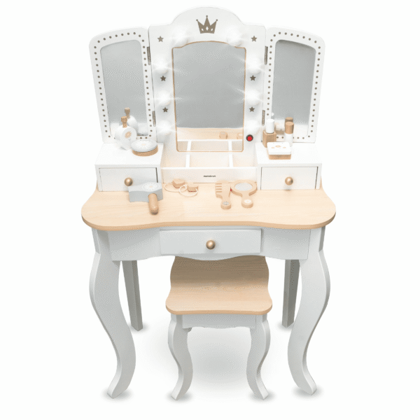 Kosmetinis staliukas mergaitei – puikus pasirinkimas kiekvienai mergaitei, kuri mėgsta leisti laiką grožio ritualams ir įsitraukti į kūrybišką žaidimą. Klasikinio dizaino baldas su trimis veidrodžiais sukurtas taip, kad suteiktų džiaugsmo ne tik žaidžiant, bet ir papildytų vaiko kambario interjerą stilinga detale. Šis žaislas padės mažosioms kopijuoti savo mamas, vyresnes seses ar net mėgstamas pasakų herojes.