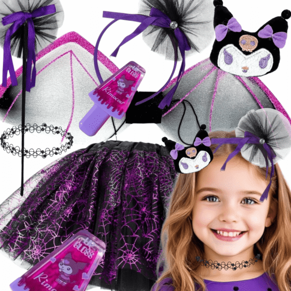 Žavingas „Kuromi“ kostiumas mažajai Sanrio gerbejai – su tiulio sijonėliu, sparnais, kaklo papuošalu ir net blizgiu! Stilingas Helovyno ar gimtadienio įvaizdis.
