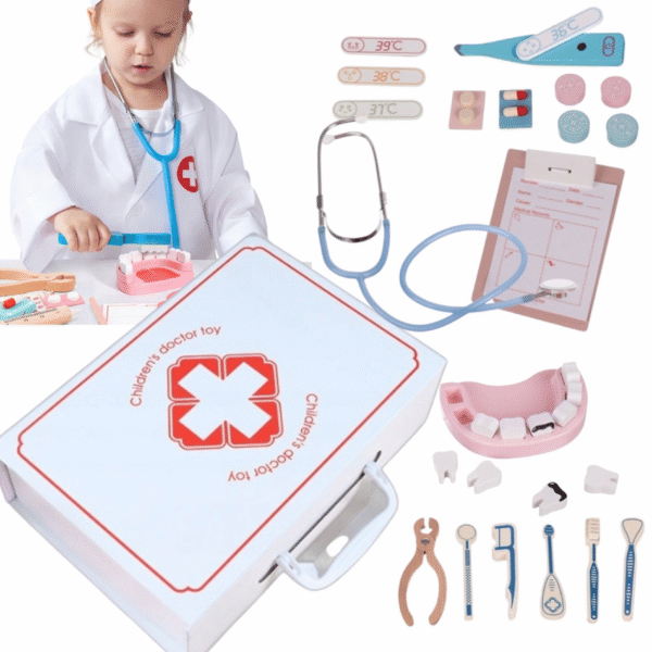 Šis 21 dalių Medinis gydytojo rinkinys leidžia vaikams pasijusti tikrais gydytojais ar slaugytojais. Jame – stetoskopas, švirkštas, termometras, dantų modelis, tvarstis ir kiti priedai, kurie leidžia atlikti „tikras“ procedūras ir suteikia žaidimams nepaprasto tikroviškumo.