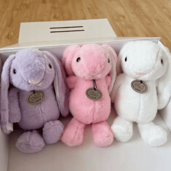 Mielas pliušinis triušis 25 cm – minkštas ir lengvas draugas žaidimams, apkabinimui ir ramybei. Balta spalva – elegantiška ir universali, lengvai derinama prie kitų žaislų.
