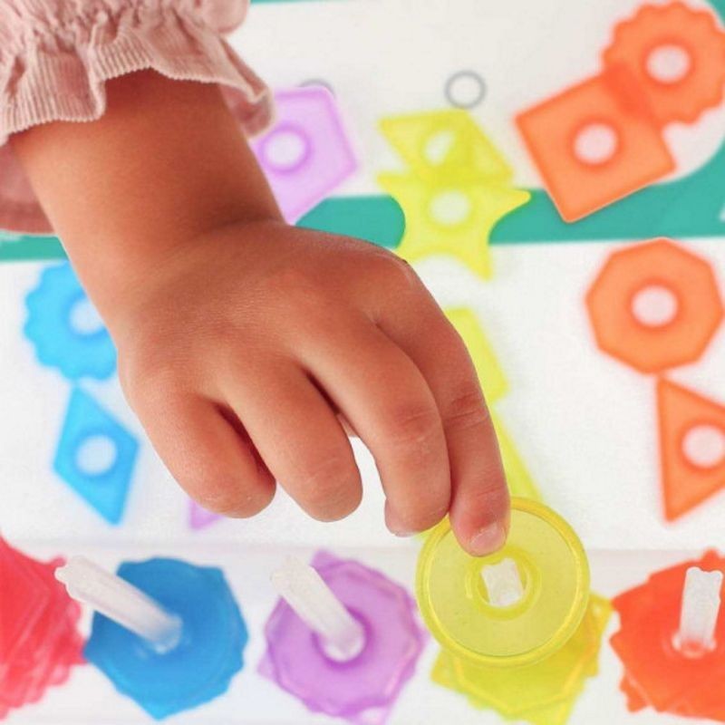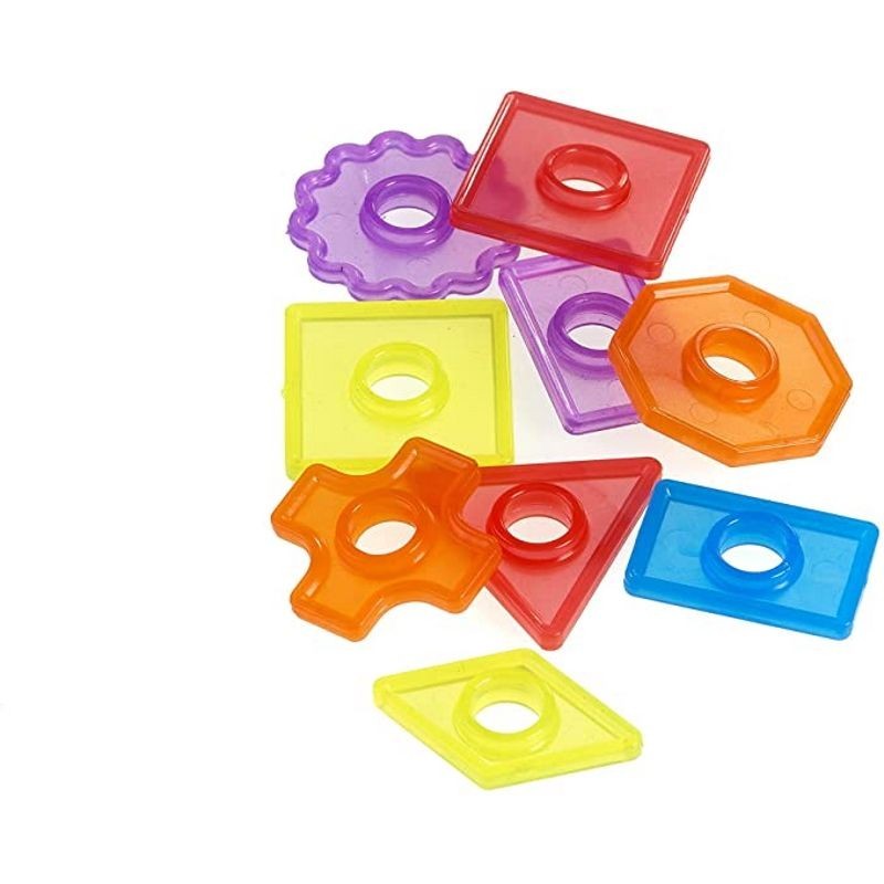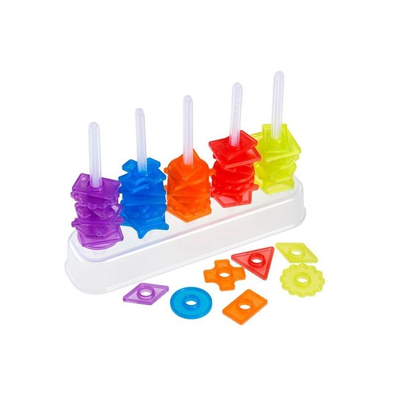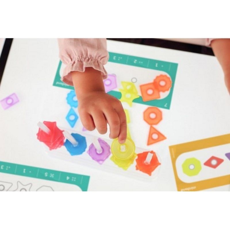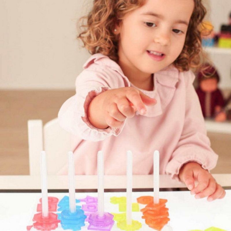 Skaidrus lavinamasis rinkinys – permatomas plastikinis stovas su 5 skilčių vietomis ir 50 skirtingų spalvų bei formų detalių suteikia vaikams patrauklų ir smagų būdą lavinti klasifikavimo bei serijų pažinimo įgūdžius. Skaidrios detalės leidžia žaisti ir su šviesos stalu, o virvelės – atlikti papildomas vėrimo užduotis.