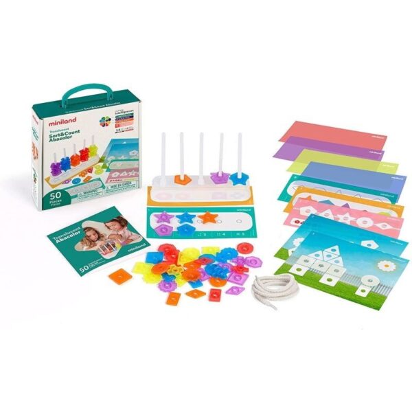 Miniland skaidrus lavinamasis rinkinys – edukacinis žaislas vaikams nuo 3 metų. Rinkinyje permatomas stovas, 50 spalvotų detalių, užduočių kortelės ir virvelės. Lavina smulkiąją motoriką, dėmesio koncentraciją, pažintines ir matematikos įgūdžius, o dėliojant detales su virvelėmis – dar ir vėrimo įgūdžius.