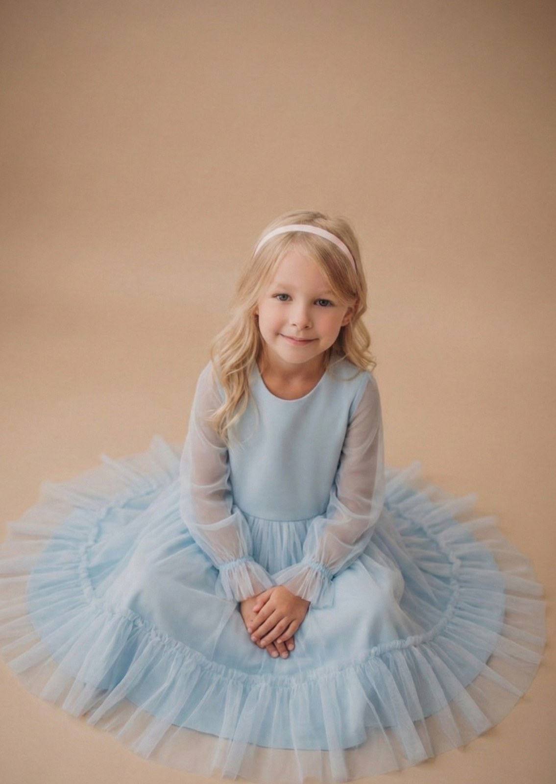 Švelnios žydros spalvos tiulio suknelė – gaivus ir elegantiškas pasirinkimas ypatingoms progoms. Ilgos permatomos rankovės su raukiniais ir lengvai besisukantis siluetas sukuria romantišką, šventinį įvaizdį.