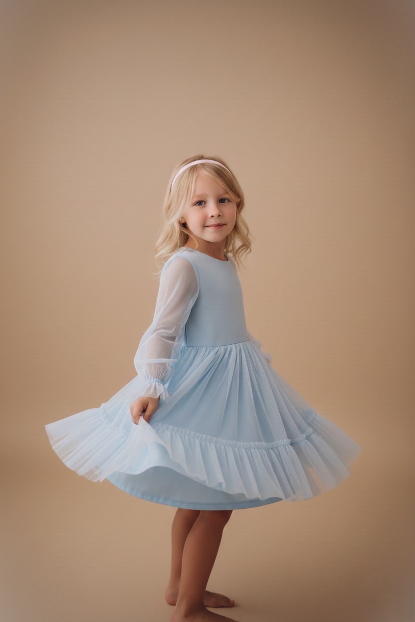 Žydra tiulio suknelė mergaitei –  tai modelis, kuris žavi išgryninta estetika. Gaivi žydra spalva suteikia modeliui lengvumo ir šviesos. Tai suknelė, kuri išlaiko balansą tarp žaismingumo ir elegancijos – idealiai tinka mergaitėms, kurios nori atrodyti puošniai, bet jaustis laisvai.